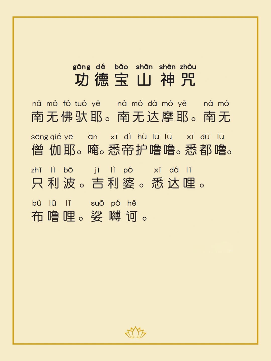 念《功德宝山神咒》之前可以祈求“请大慈大悲观世音菩薩保佑我XXX(您的名字),可以把过去所做善事转化成功德,保佑我某事顺利”。